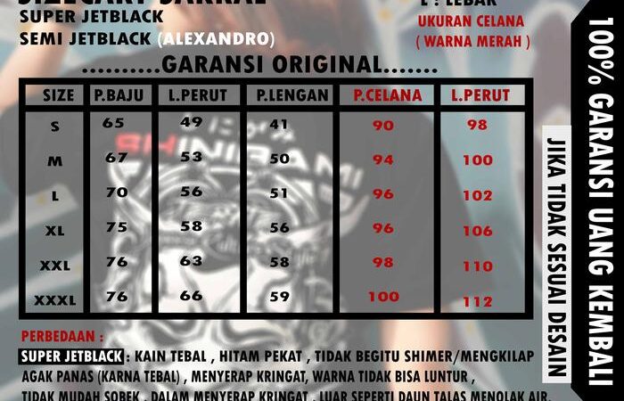 • Semi Jetblack/Super Jetblack: Jenis kain kaos yang memiliki karakteristik khusus; Semi Jetblack lebih ringan dan mengilap, sedangkan Super Jetblack lebih tebal dan kuat. Keduanya dikenal nyaman dan awet.
