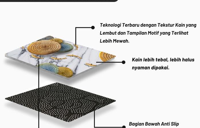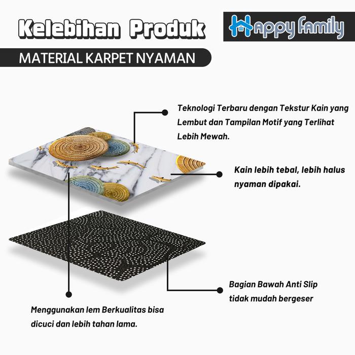 • Alas Anti Slip: Bagian bawah karpet yang didesain dengan material khusus untuk mencengkeram lantai, mencegah karpet bergeser dan mengurangi risiko tergelincir.
