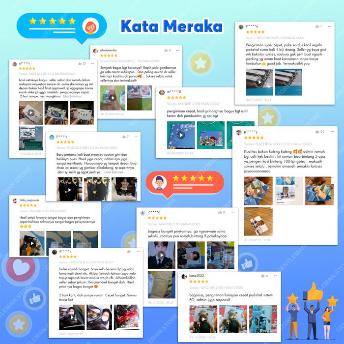 Nikmati kemudahan bertransaksi dengan kartu custom E-Money dari berbagai bank (Brizzi BRI, Flazz BCA, Tapcash Mandiri, BNI S1, dll.). Cetak gambar favorit Anda di bagian depan, sementara bagian belakang tetap menggunakan desain standar bank.