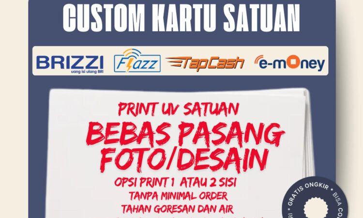 Tunjukkan gaya personalmu dengan kartu e-money custom! Cetak foto, desain, atau artwork favoritmu di kartu Flazz, Brizzi, atau TapCash. Lupakan kartu biasa-biasa dan miliki kartu pembayaran digital yang unik dan eksklusif hanya untukmu.