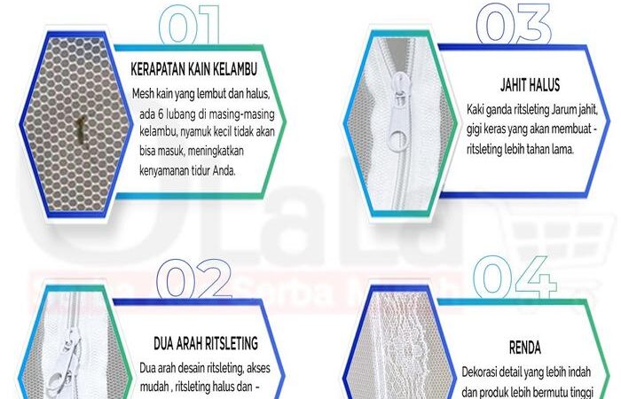 - Ritsleting: Pembuka dan penutup pintu kelambu yang terbuat dari gigi-gigi logam atau nylon yang saling mengait, memudahkan akses masuk dan keluar sekaligus menjaga serangga tetap di luar.