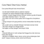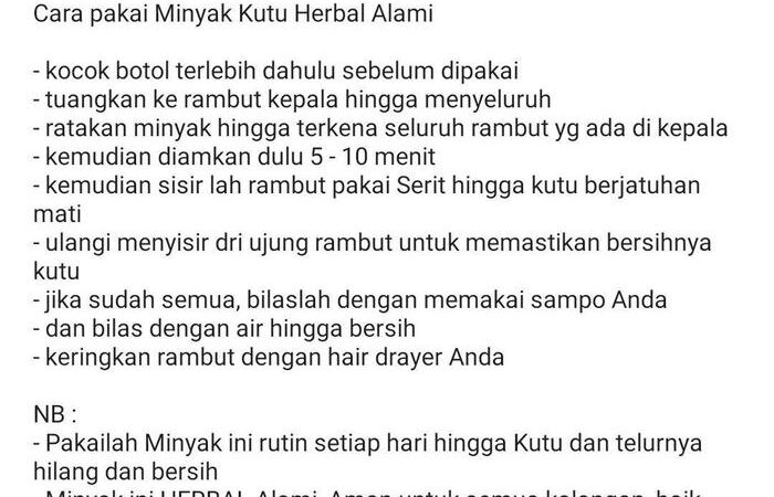 | Berbahan dasar minyak kelapa murni yang dikenal efektif membasmi kutu dan telurnya (lendir). | 2. Diamkan: Tutup rambut dengan shower cap dan biarkan selama minimal 30 menit. Produk akan bekerja membunuh kutu hingga ke akarnya. |
