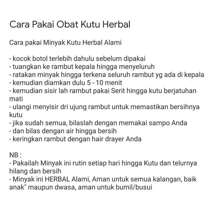 | Berbahan dasar minyak kelapa murni yang dikenal efektif membasmi kutu dan telurnya (lendir). | 2. Diamkan: Tutup rambut dengan shower cap dan biarkan selama minimal 30 menit. Produk akan bekerja membunuh kutu hingga ke akarnya. |