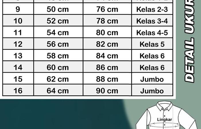 | 10 | 52 cm | 78 cm | 22 – 25 kg | Kelas 3 – 4 |