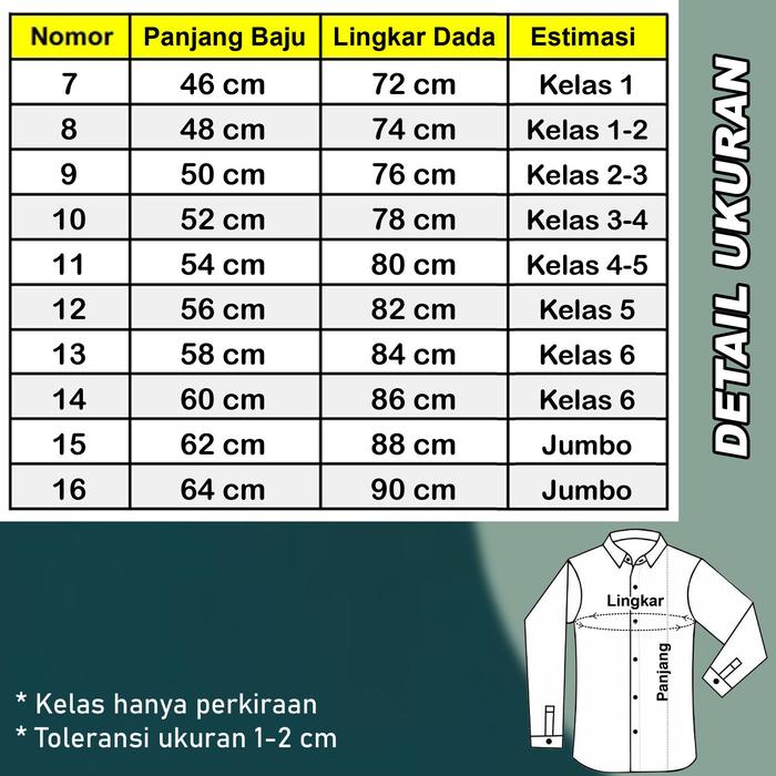 | 14 | 60 cm | 86 cm | 40 – 45 kg | Kelas 6 |
