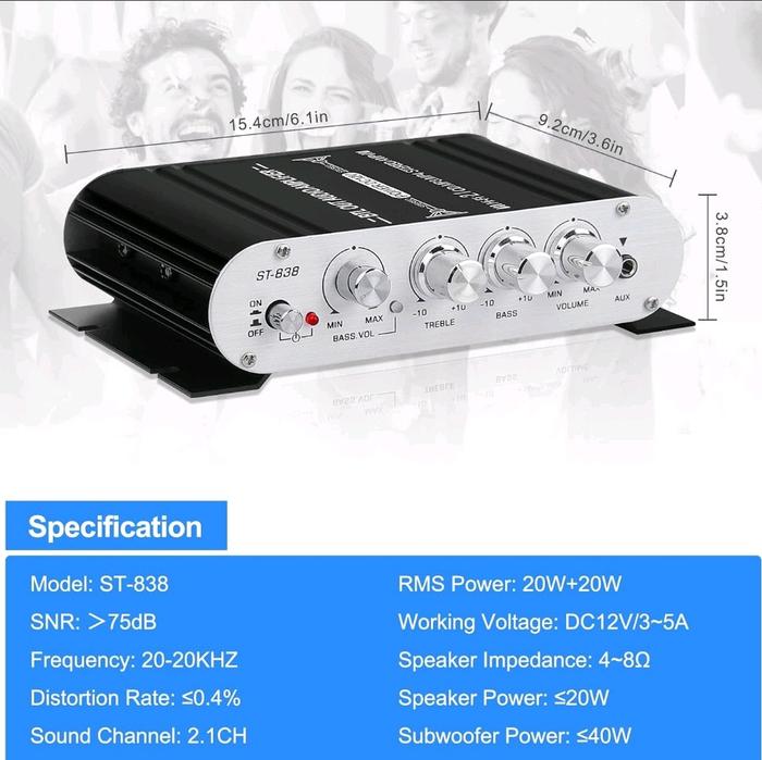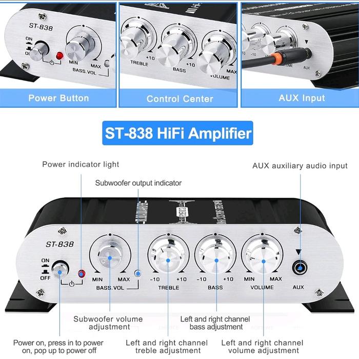 Tingkatkan pengalaman mendengar musik di mobil Anda secara instan dengan Kerndy ST-838. Amplifier mini yang powerful ini dirancang khusus untuk menghadirkan kualitas audio Hi-Fi yang jernih dan berdimensi di dalam kendaraan Anda. Dengan kontrol treble, bass, dan volume yang terpisah, Anda dapat menyetel suara sesuai keinginan dan karakter musik favorit, dari bass yang dalam hingga vokal yang tajam.