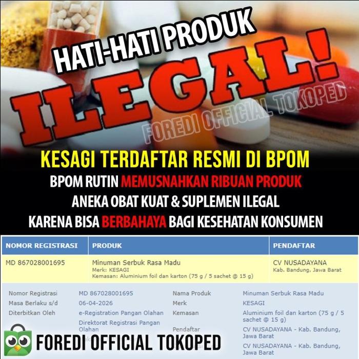 Nikmati kesegaran alami dan khasiatnya dalam setiap tegukan! KESAGI ASLI adalah minuman serbuk dengan rasa madu yang lezat, diformulasikan khusus untuk memberikan manfaat optimal. Produk ini telah terdaftar resmi di BPOM RI MD 867028001695, sehingga Anda dapat mengonsumsinya dengan keyakinan akan keamanan dan kualitasnya.