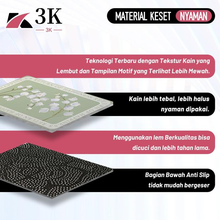 - Anti Slip: Fitur pada bagian bawah keset yang dirancang untuk mencegah geseran, memberikan cengkeraman yang kuat pada lantai, dan meningkatkan keamanan dengan mengurangi risiko terpeleset.