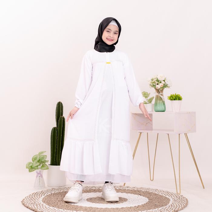 Detailnya semakin mewah dengan variasi payet Swarovsky yang berkilau dan variasi tangan karet pada lengan untuk kesan anggun. Tali pinggang yang disertakan dapat menciptakan bentuk yang lebih rapi. Desainnya praktis dengan bukaan sleting depan, memudahkan anak memakai dan melepasnya sendiri. Gamis ini tersedia dalam berbagai ukuran dari M hingga Allsize Dewasa.