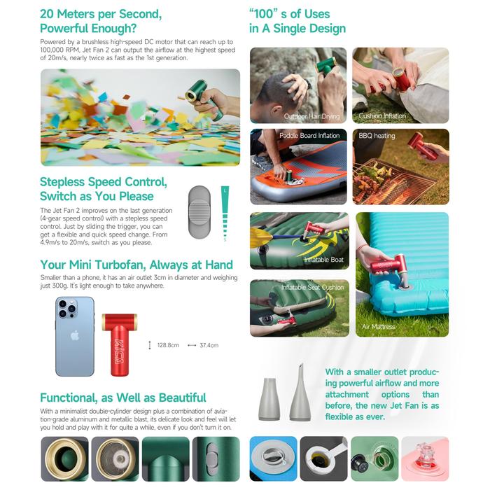 Kica JetFan 2 bukan sekadar kipas. Alat ini adalah solusi pintar untuk berbagai situasi: membersihkan debu halus pada sensor kamera atau keyboard, menciptakan efek angin alami untuk sesi fotografi, memompa balon dan kasur udara dengan mudah, hingga membantu menyalakan api unggun saat berkemah. Kreasikan penggunaannya sesuai kebutuhan Anda!
