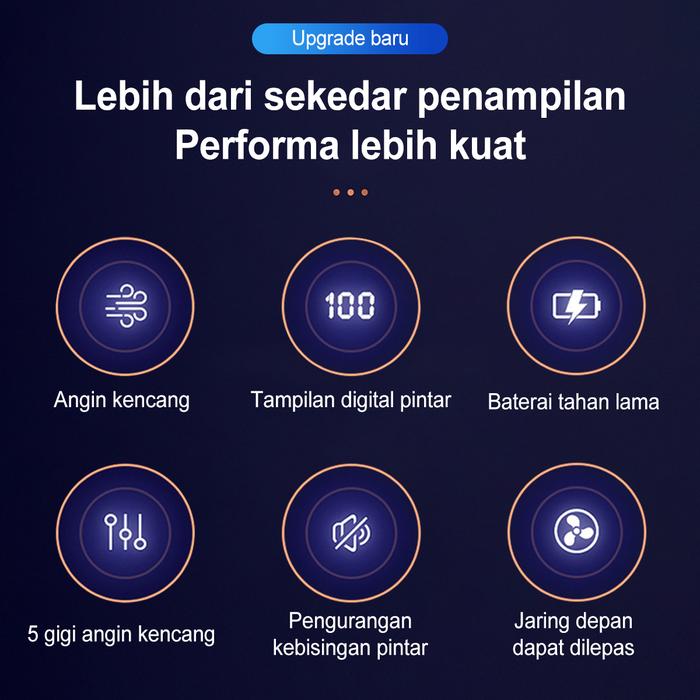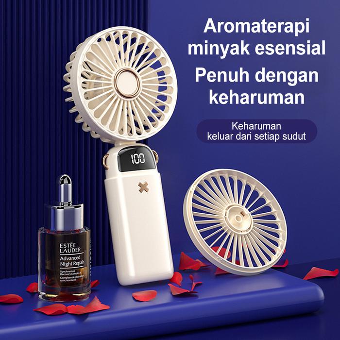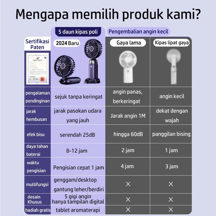 - Dapat digunakan sebagai kipas genggam, kipas meja (dilipat 190°), atau kipas leher (dilengkapi tali).