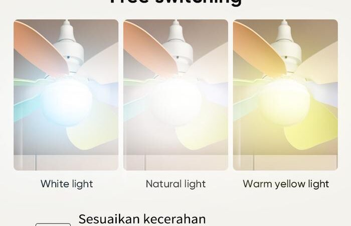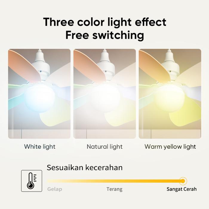 Hadir solusi hemat ruang dan energi untuk rumah Anda! Kipas angin plafon ini dilengkapi lampu LED terintegrasi yang dapat disesuaikan warna dan tingkat terangnya (3000K-6500K). Dilengkapi remote control, Anda dapat mengatur 3 tingkat kecepatan angin, arah putaran (mode musim panas & dingin), serta timer 1/2/4 jam untuk operasi otomatis.