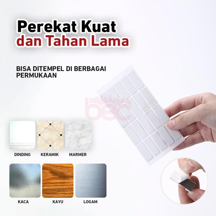 - Pemasangan Mudah: Lengket dengan kuat di berbagai permukaan bersih dan rata seperti kayu, kaca, atau tembok menggunakan perekat yang sudah tersedia. Tidak merusak permukaan saat dilepas.
