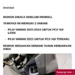 | Kompatibilitas | Didesain khusus untuk Honda PCX 160. Tersedia dalam 2 varian: varian 2021-2024 dan varian terbaru 2025. |