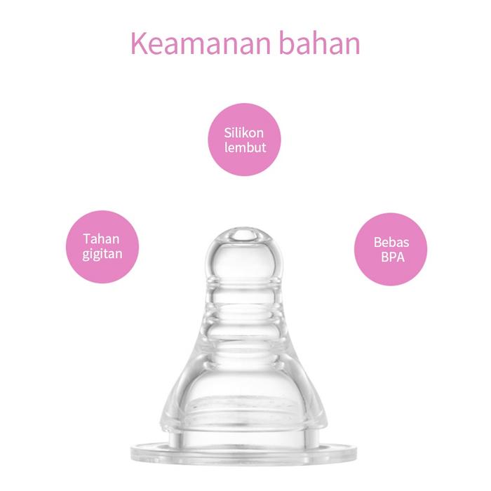| Ukuran Lubang & Rekomendasi Usia | – S (Round Hole): 0-3 bulan – M (Round Hole): 3-6 bulan – L (Round Hole): 6-12 bulan – + (Cross Hole): 12+ bulan (aliran variabel) |