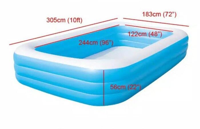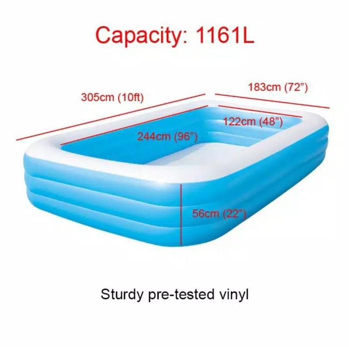 Dibuat dari material vinyl berkualitas tinggi yang telah teruji ketahanannya terhadap tekanan air dan cuaca. Dilengkapi dengan dinding samping yang ekstra lebar dan sistem ring udara ganda (atau triple) yang menjaga struktur kolam tetap stabil, sehingga aman untuk anak-anak dan dewasa. Katup pembuangan air terpisah memudahkan proses pengurasan dan perawatan.