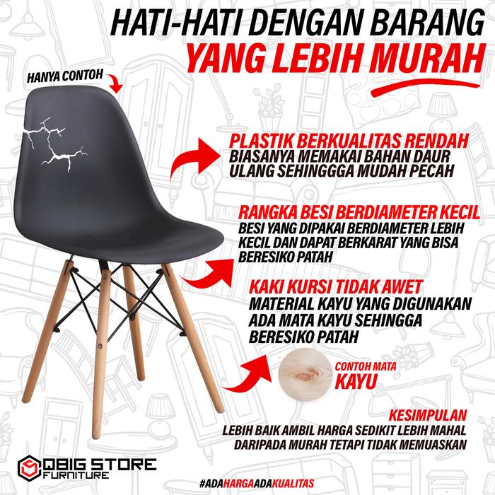 Seluruh rangka kursi terbuat dari besi kuat dan dilengkapi dengan kaki kayu solid yang menjadikannya stabil dan tahan lama. Setiap kursi dikirim dalam kondisi knock-down untuk memudahkan proses pengiriman dan memastikan barang sampai dengan selamat.