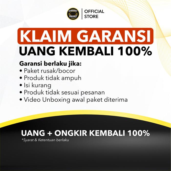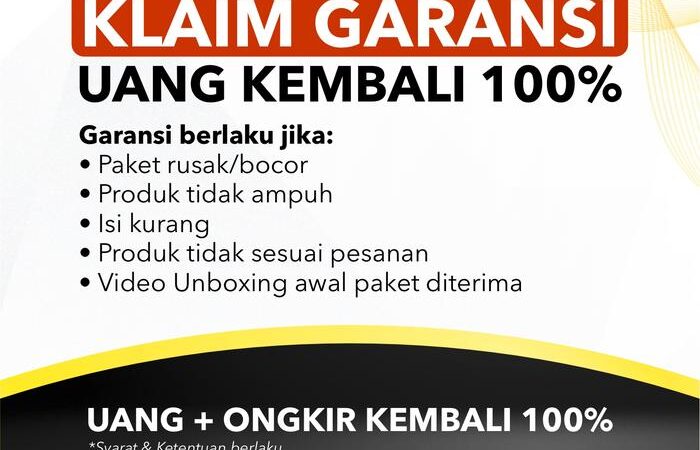Jika produk mengalami kebocoran saat pengiriman, tidak sesuai pesanan, atau tidak memberikan hasil seperti deskripsi, kami jamin pengembalian dana dan ongkos kirim 100% tanpa perlu retur produk. (Syarat: Belum memberikan ulasan/rating di platform pembelian).