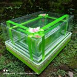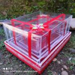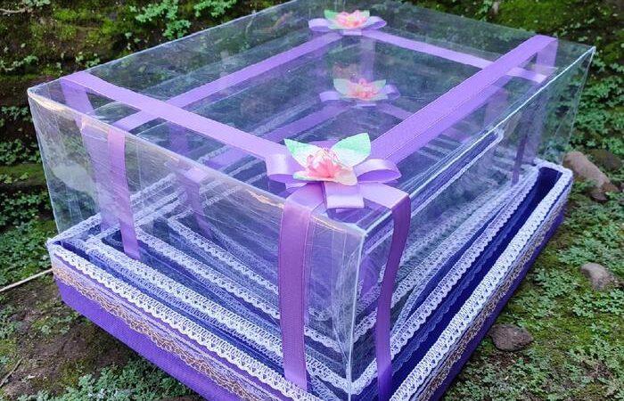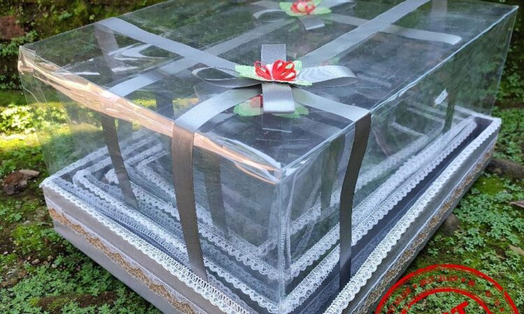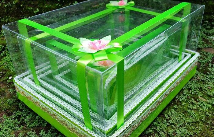 Kotak terbuat dari kardus tebal doublewall yang sangat kuat namun tetap ringan untuk efisiensi biaya pengiriman. Bagian luar dilapisi kain Spunbond premium dan dilengkapi tutup mika tebal bening yang telah ditempel dengan dobel tape untuk memudahkan perekatan. Setiap kotak dihiasi dengan pita dan bunga hias cantik di bagian atas dan samping (desain bunga dapat bervariasi).