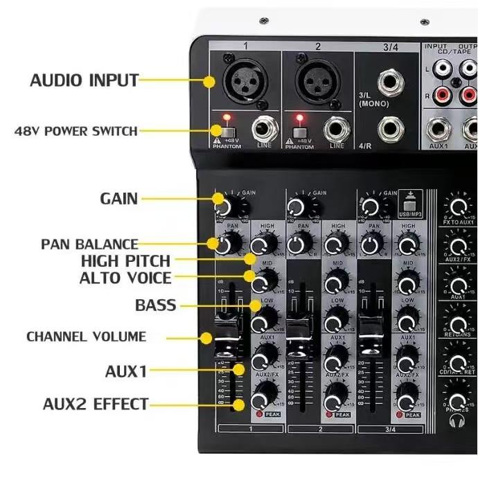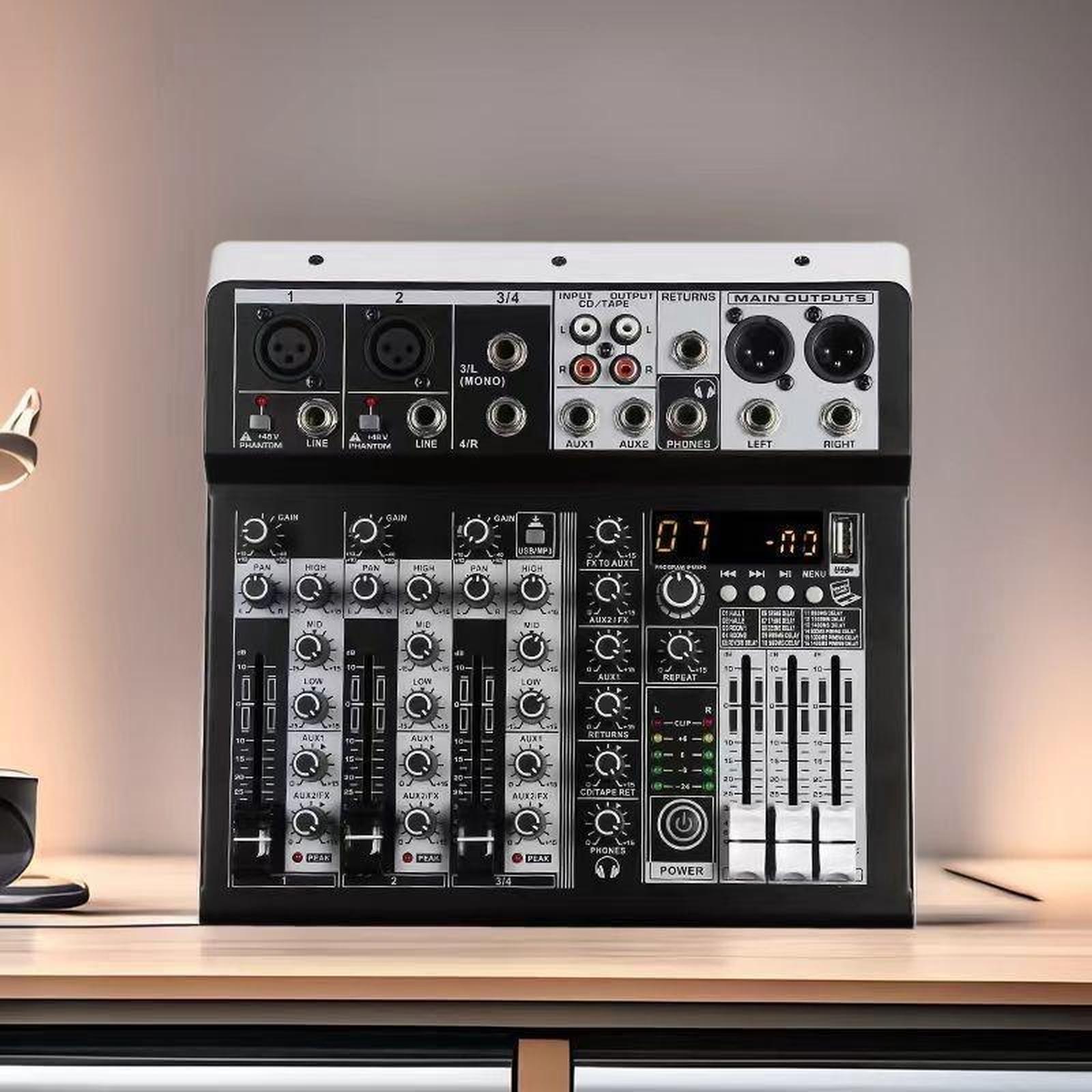 Tingkatkan kualitas audio performa Anda dengan KP4 Audio Mixer yang dirancang untuk penggunaan profesional baik indoor maupun outdoor. Mixer ini menawarkan fleksibilitas luar biasa dengan 4 input mono (dilengkapi phantom power +48V per saluran untuk mikrofon kondenser) dan 4 input stereo, sehingga dapat menerima banyak sumber audio sekaligus.
