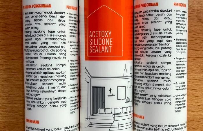 - Acetoxy / Tipe Asam: Jenis silicone sealant yang mengeluarkan aroma seperti cuka (asam asetat) saat mengering. Kelebihannya adalah memiliki daya rekat yang sangat kuat dan cepat kering, cocok untuk bahan seperti kaca dan keramik. Disarankan untuk digunakan di area yang memiliki ventilasi udara baik.