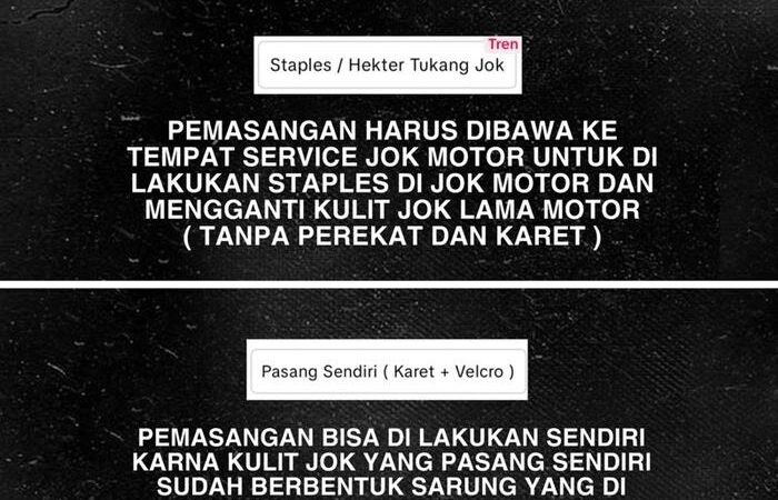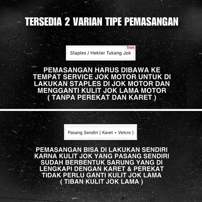 | Kesesuaian Model | Harap diperhatikan: Pastikan model kulit jok sesuai dengan tipe motor Anda sebelum checkout. Kesalahan pemilihan jenis/model bukan menjadi tanggung jawab seller. |