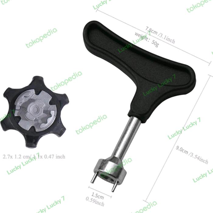 - Golf Spike Wrench: Alat khusus berbentuk seperti kunci pas yang didesain untuk mencengkeram dan memutar softspike agar dapat dikencangkan atau dilepas dengan mudah dari sol sepatu.