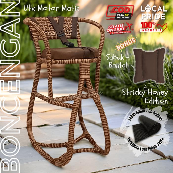 Dirancang khusus untuk motor matic dengan dek/pijakan kaki yang rata seperti Honda Beat, Honda Vario, Yamaha Mio, Honda Scoopy, dan sejenisnya. Terbuat dari bahan rotan asli berkualitas tinggi yang dikombinasikan dengan anyaman sintetis, menjadikan kursi ini kokoh dan tahan lama.