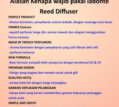 Telah hadir La Bonte Reed Diffuser, solusi akhir untuk masalah pengharum ruangan Anda. Apakah Anda pernah mengalami masalah seperti aroma yang tidak menyebar, cepat habis dalam hitungan minggu, atau bahkan menimbulkan rasa pusing dan mual? Mungkin Anda juga lelah dengan produk yang aromanya tidak konsisten dan proses penggunaan yang merepotkan.