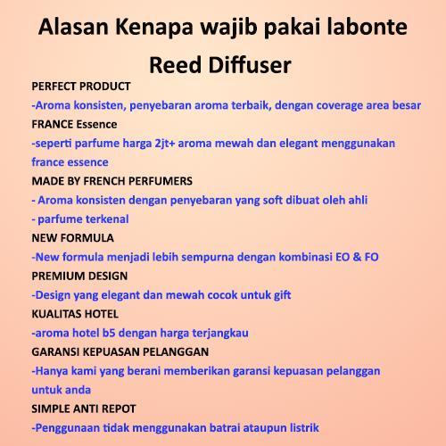 Produk ini bukan sekadar pengharum, tetapi juga berfungsi sebagai aromaterapi untuk meningkatkan kesehatan, relaksasi, dan mood booster. Dengan kualitas super premium, La Bonte menawarkan harga yang sangat terjangkau. Penggunaannya pun sangat praktis—cukup tempatkan botol dan masukkan stick-nya, selesai.