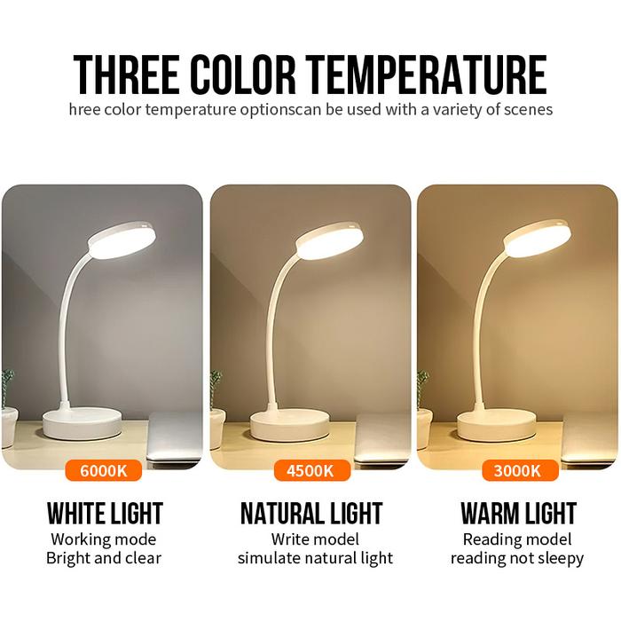 Dilengkapi dengan teknologi sentuh yang modern, menyalakan dan mengatur lampu menjadi sangat mudah. Pilih dari tiga variasi suhu warna (3000K-6500K) untuk menyesuaikan pencahayaan dengan aktivitas, apakah untuk membaca yang membutuhkan ketajaman atau bersantai dengan cahaya yang hangat. Leher lampu yang fleksibel memungkinkan Anda mengarahkan cahaya secara tepat ke area yang diperlukan, mengurangi silau dan kelelahan mata.
