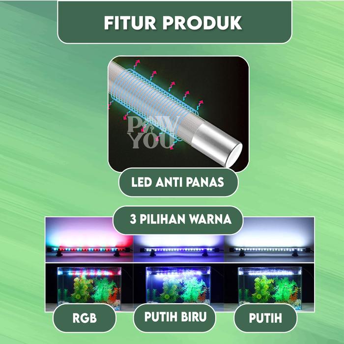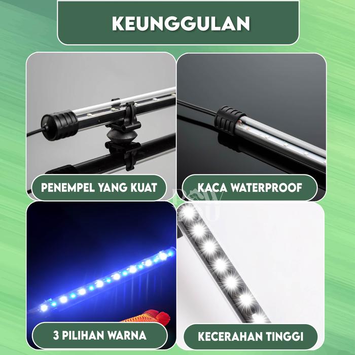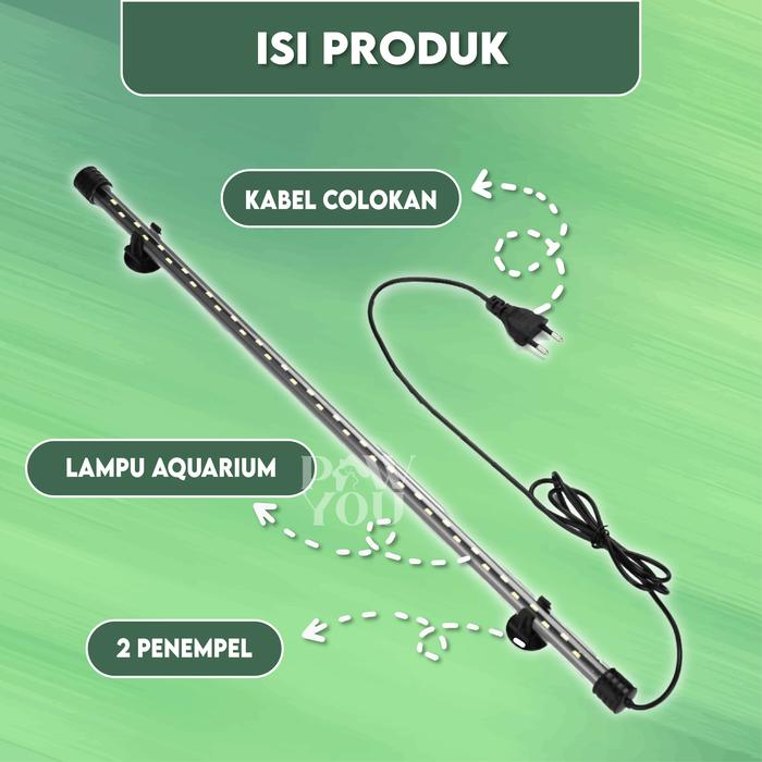 Tampilkan keindahan akuarium Anda dengan pencahayaan sempurna! Lampu LED celup kami dirancang khusus untuk menghidupkan dunia bawah air, memberikan aksen cahaya menawan yang mempercantik tampilan aquascape dan mengoptimalkan kesehatan ikan hias serta cupang Anda. Tersedia dalam tiga pilihan ukuran panjang (15 cm, 35 cm, dan 55 cm) untuk disesuaikan dengan berbagai dimensi akuarium.