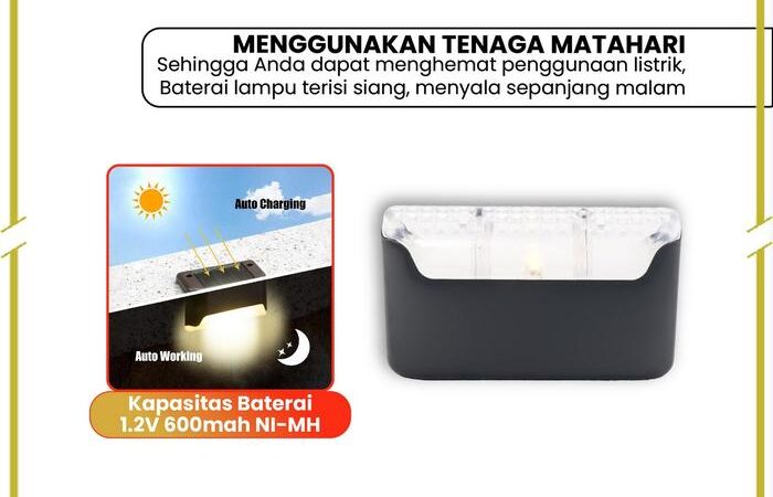 BateraiNi-MH 1.2V 600mAh, terisi otomatis di siang hari dan siap digunakan semalaman.