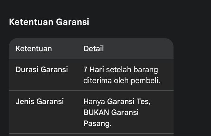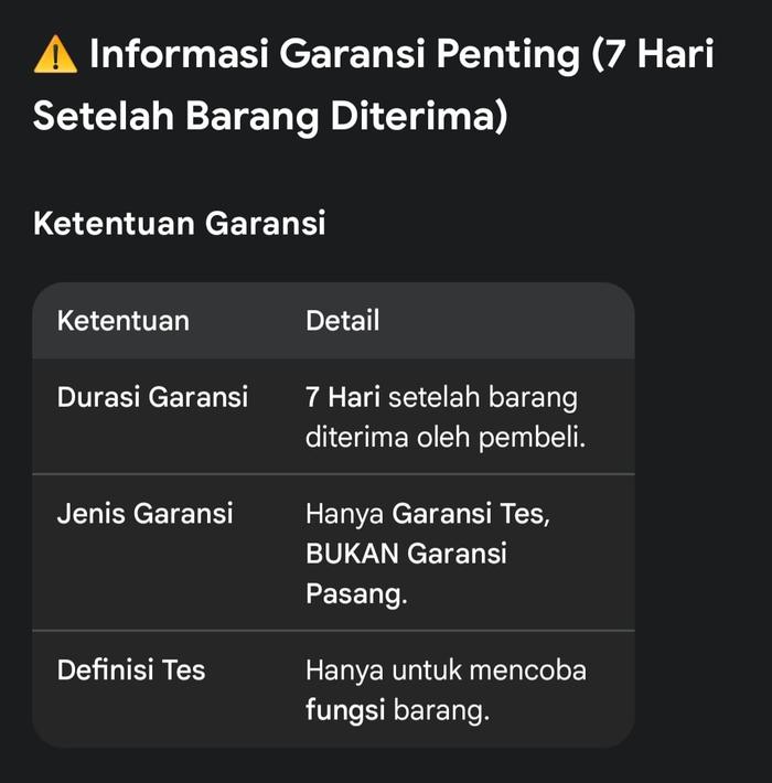 - Garansi Test: Jenis garansi yang hanya mencakup pengujian fungsi barang saat pertama kali diterima. Barang harus masih tersegel plastik dan belum dipasang. Garansi ini tidak berlaku jika barang sudah dicoba untuk dipasang ke perangkat.