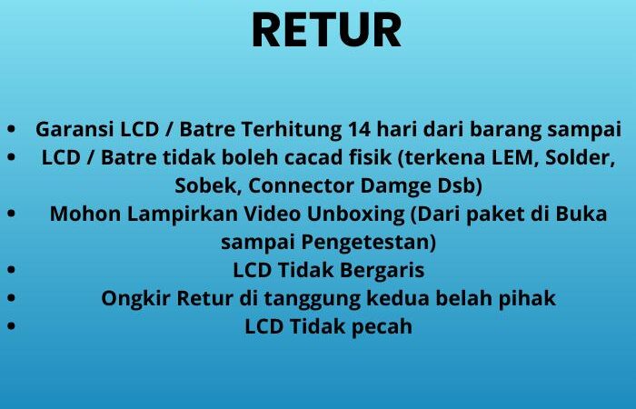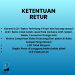 | Syarat & Ketentuan Garansi | Barcode segel utuh tidak rusak. Fisik tidak cacat (IC LCD retak/pecah/bekas lem). Flexible tidak putus/robek. Tidak kena cairan. Plastik LCD belum dibuka. Tidak bergaris. |