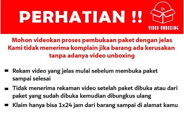 | Kebijakan Komplain/Retur | WAJIB sertakan video unboxing tanpa potongan sebagai bukti klaim. TANPA VIDEO, KOMPLAIN TIDAK DAPAT DIPROSES. Batas retur 3×24 jam setelah paket diterima. |