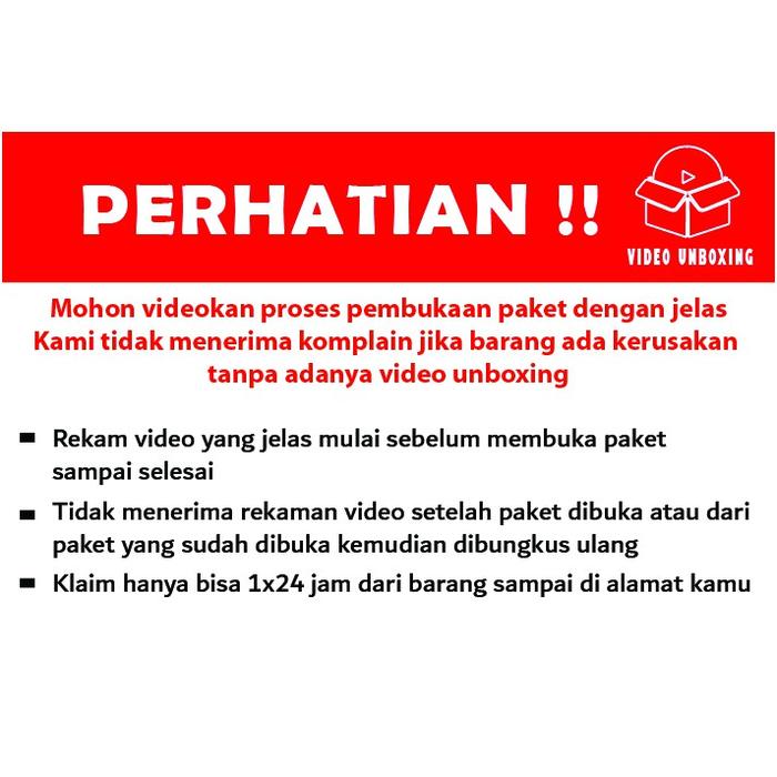 | Kebijakan Komplain/Retur | WAJIB sertakan video unboxing tanpa potongan sebagai bukti klaim. TANPA VIDEO, KOMPLAIN TIDAK DAPAT DIPROSES. Batas retur 3×24 jam setelah paket diterima. |