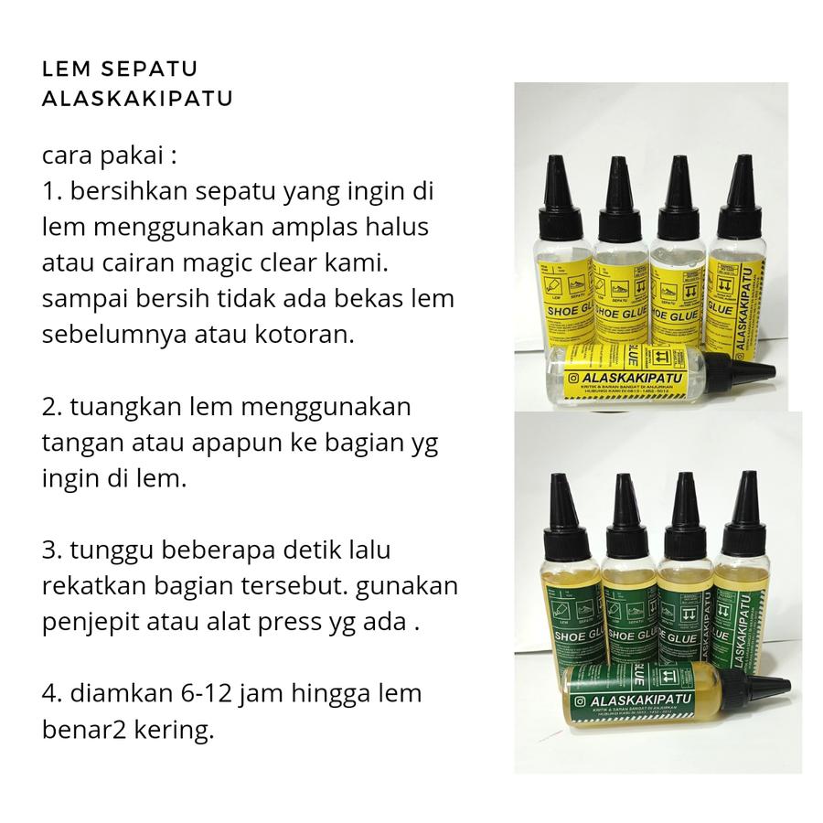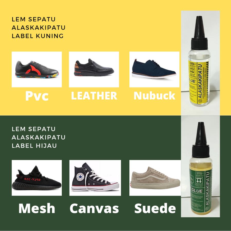 - Saat checkout, sertakan pilihan warna lem (kuning atau hijau) sesuai kebutuhan bahan sepatu.