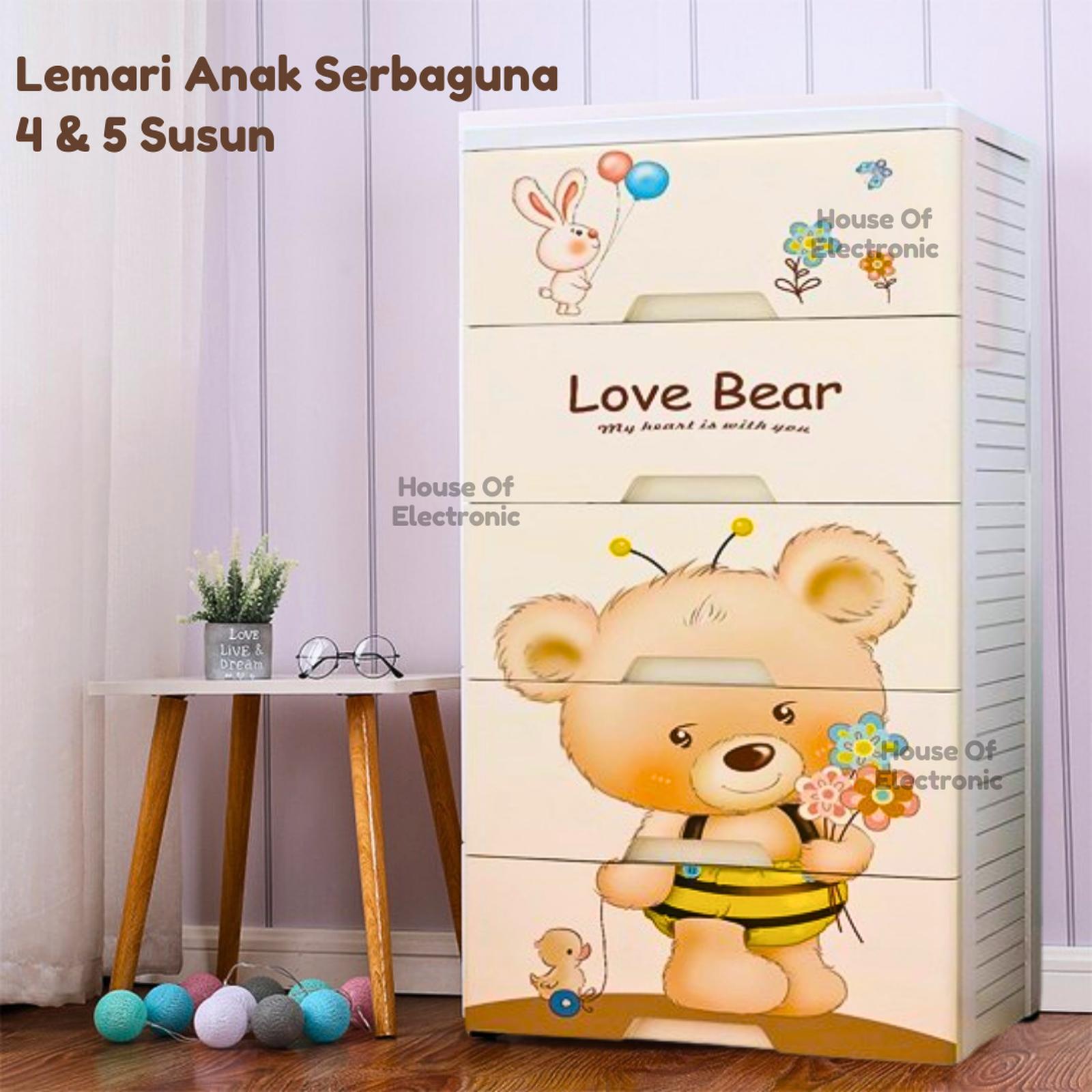 Lemari penyimpanan dengan karakter Bear yang menggemaskan ini dirancang khusus untuk si kecil. Tidak hanya berfungsi sebagai tempat menyimpan pakaian, mainan, atau perlengkapan bayi, lemari ini juga membantu melatih kemandirian dan kerapian anak sejak dini. Desainnya yang cerah dan colorful akan menjadi aksen dekorasi yang mempercantik kamar.