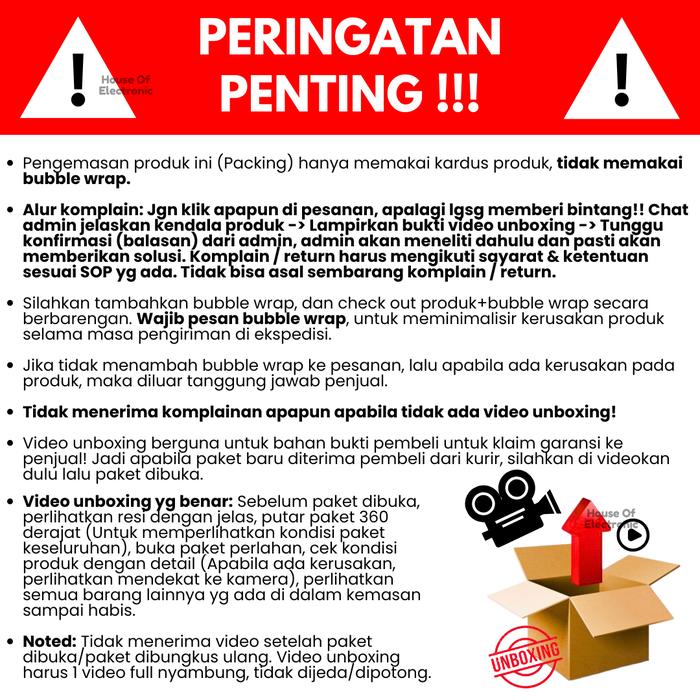 Penting! Produk dikirim menggunakan kardus asli. Sangat disarankan untuk menambahkan bubble wrap sebagai pelindung tambahan selama pengiriman untuk menghindari kerusakan.