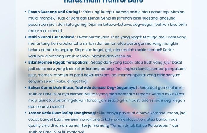 | Konten | Truth yang menantang untuk ungkap rahasia terdalam dan Dare yang seru serta menegangkan untuk ciptakan teriakan heboh. |