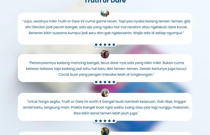 | Jumlah Kartu | 50 kartu (25 Truth + 25 Dare) dengan tantangan yang lebih bold dan berani untuk tingkatkan intensitas permainan. |