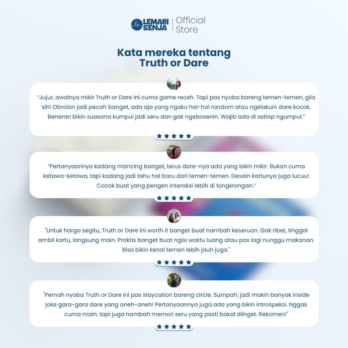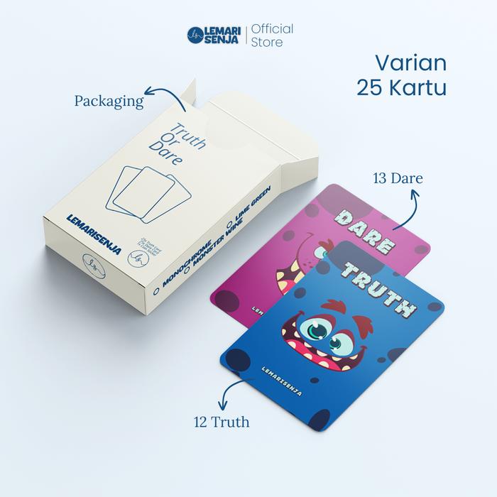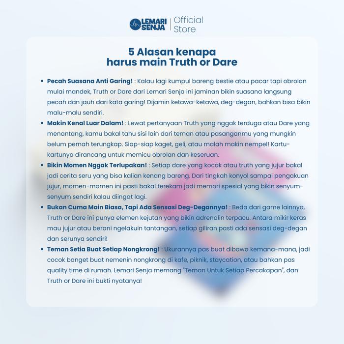 | Jumlah Kartu | 50 kartu (25 Truth + 25 Dare) dengan tantangan yang lebih bold dan berani untuk tingkatkan intensitas permainan. |