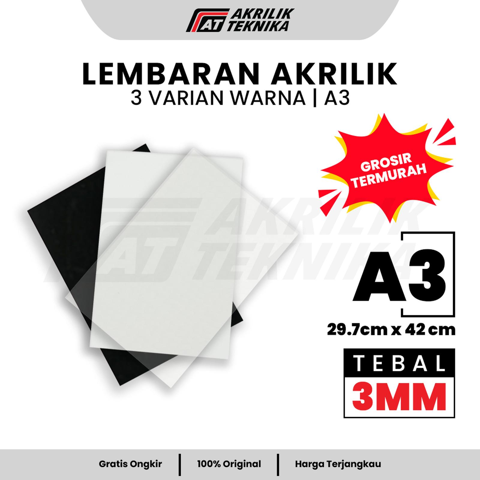 Temukan material kreatif premium untuk segala kebutuhan proyek Anda. Lembaran akrilik berukuran standar A3 (42 cm x 29,7 cm) dengan ketebalan 3mm ini terbuat dari bahan akrilik berkualitas tinggi yang menjamin kejernihan maksimal, kekuatan, serta ketahanan terhadap cuaca. Produk ini merupakan pilihan serbaguna untuk penggunaan indoor dan outdoor, tersedia dalam berbagai pilihan warna menarik untuk memperkaya kreasi Anda.