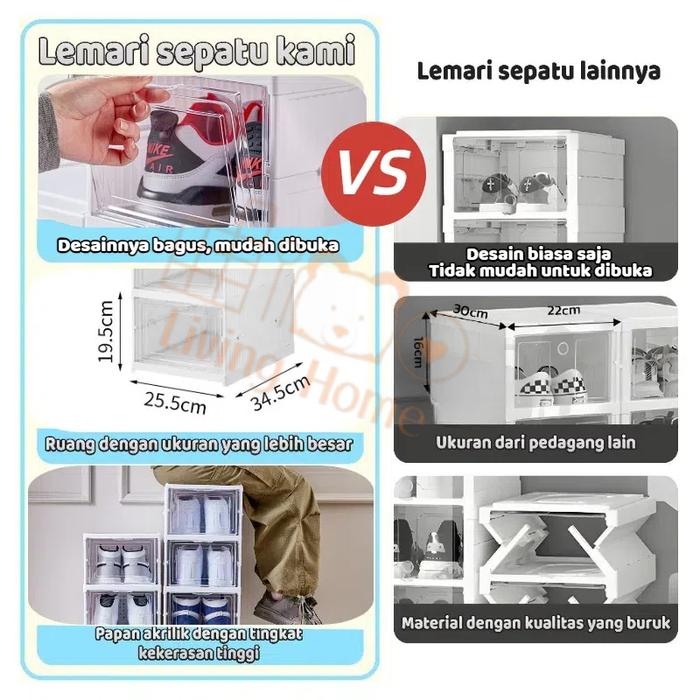 Tingkatkan kerapian ruangan dengan rak sepatu modular dari Livinghome. Dirancang khusus untuk ruang terbatas, setiap unit kotak dapat disusun dan dihubungkan secara fleksibel sesuai kebutuhan dan kreativitas Anda. Terbuat dari plastik PP berkualitas yang transparan, kuat, dan tahan lama, sehingga isinya tetap terlihat jelas dan terlindung dari debu.