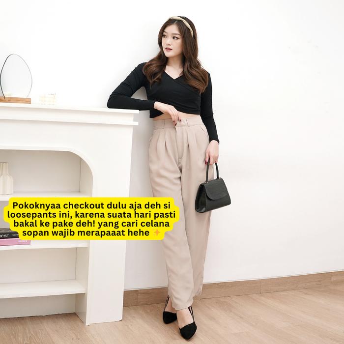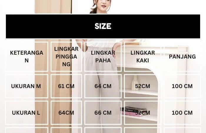 Sebagai pilihan multifungsi, celana ini cocok untuk tampilan kasual, kerja, maupun acara formal. Desain depan menggunakan pengait tanpa kancing, memberikan kesan minimalis dan modern. Panjang celana 100cm memberikan kesan elegan dan proporsional.