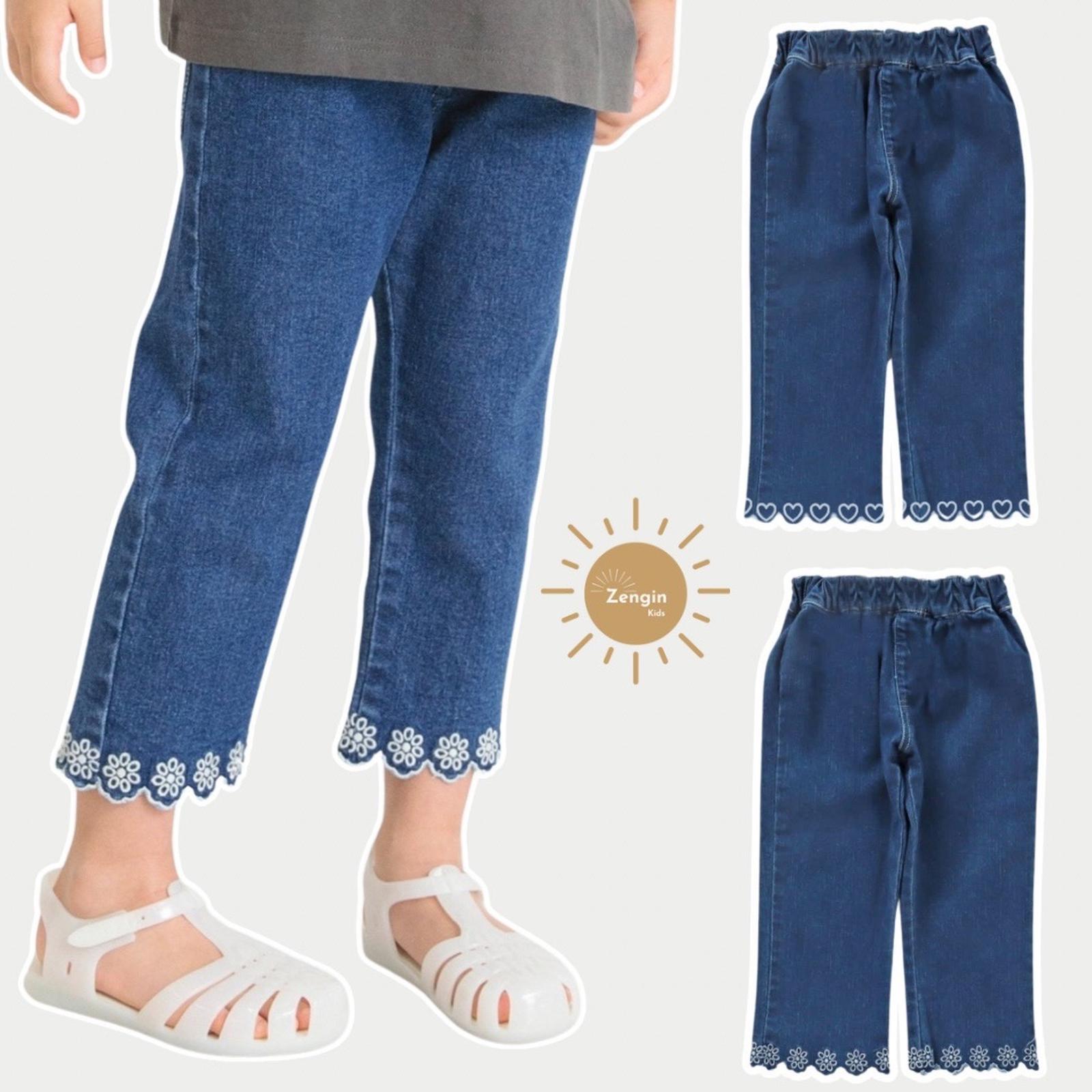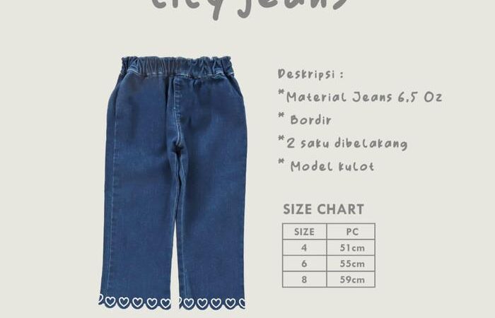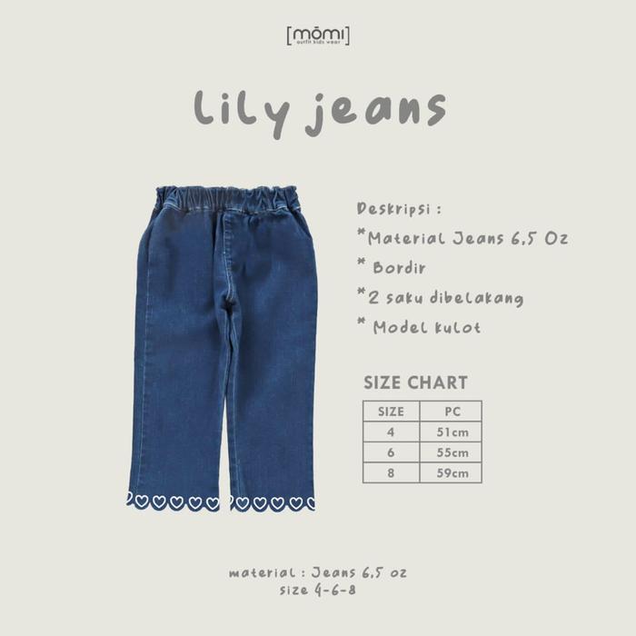 Tampil semakin menggemaskan dengan Lula Jeans! Celana kulot jeans ini didesain khusus untuk si kecil dengan material jeans 6.5 oz yang nyaman dan durable untuk beraktivitas sehari-hari. Setiap bagiannya dipenuhi detail cantik, mulai dari bordir motif love dan bunga yang indah di bagian bawah hingga pinggang dengan full karet elastis yang memudahkan anak bergerak bebas dan nyaman. Terdapat juga 2 kantong hidup fungsional di bagian belakang.