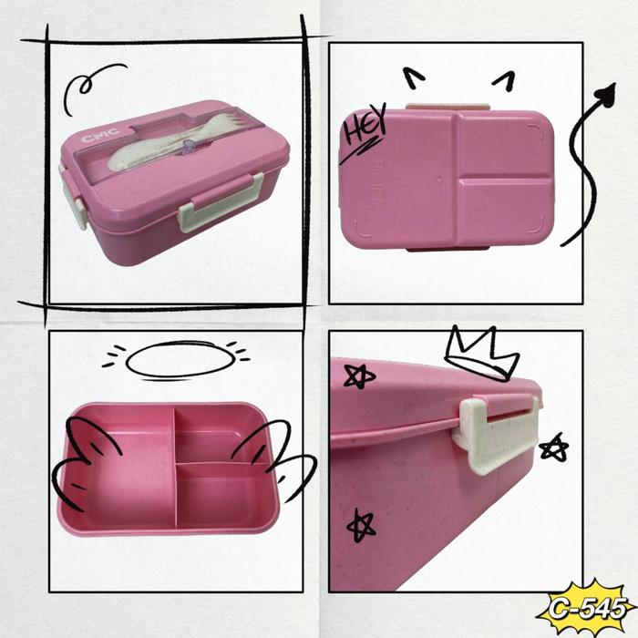 Dilengkapi dengan tiga sekat terpisah, Anda dapat memisahkan lauk, nasi, dan sayur dengan rapat tanpa khawatir tercampur rasa. Empat klip pengunci memastikan kotak makan tertutup sempurna, anti tumpah saat di dalam tas. Penutup transparannya multifungsi, dapat digunakan sebagai wadah kecap atau bahkan sandaran ponsel. Set ini sudah termasuk sendok dan garpu, lengkap siap pakai!