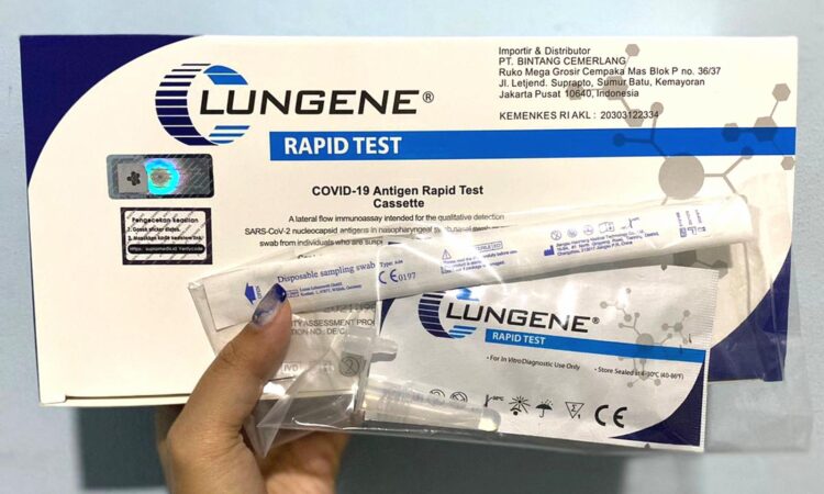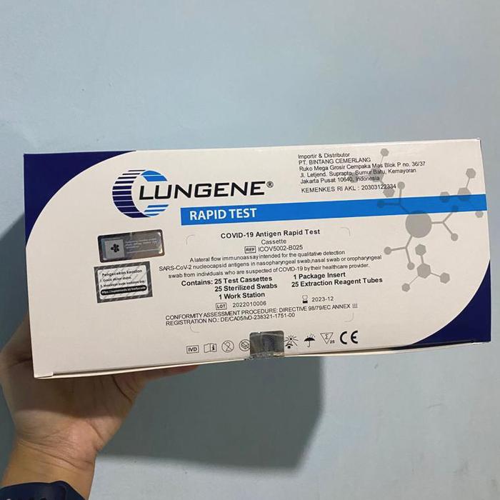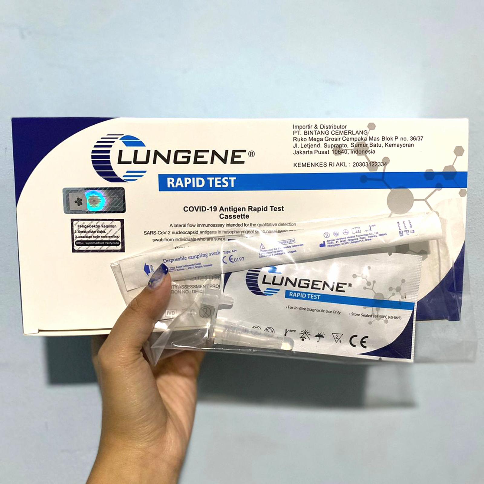 Dapatkan Lungene Biru Swab Test Antigen yang telah mendapatkan izin edar resmi dari Kemenkes RI dengan nomor AKL 20303122334. Akurasi tes ini mencapai 97% dengan mendeteksi keberadaan antigen virus secara langsung. Produk ini expired September 2024 dan lot selalu terbaru, dijamin 100% original dari produsen Clungene (Hangzhou Clongene Biotech Co Ltd, China).