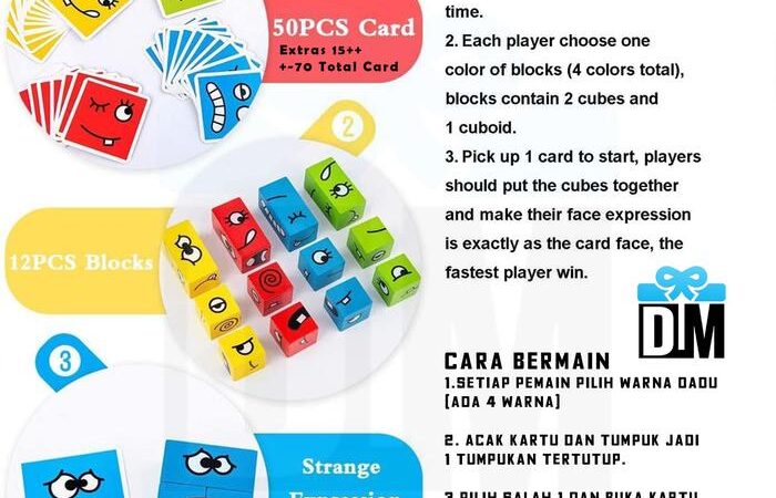 Mainan edukasi kreatif yang menyenangkan untuk anak usia 3 tahun ke atas hingga orang dewasa! Kubus balok ini dilengkapi dengan kartu tantangan yang berisi berbagai kombinasi wajah. Anak-anak dapat berlatih menyusun balok mengikuti pola pada kartu, sementara dewasa bisa berlomba menyelesaikan tantangan atau menyusun paling banyak dalam waktu tertentu.